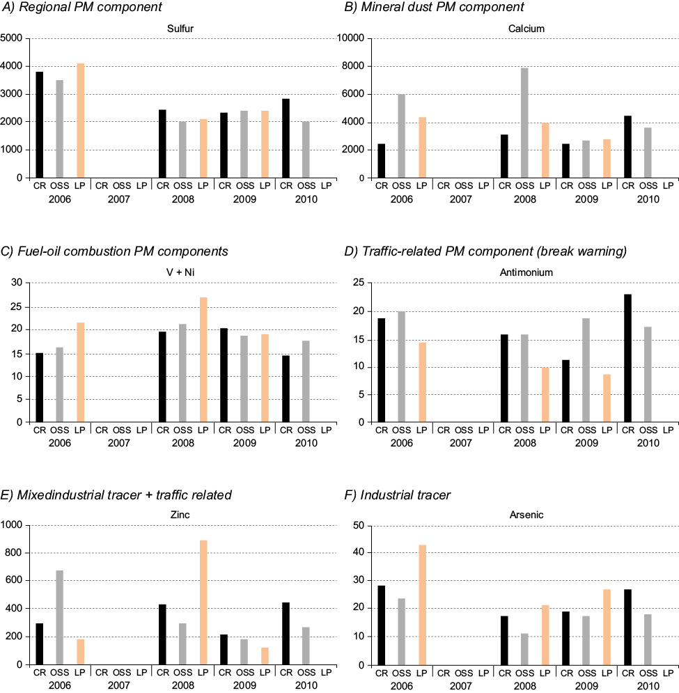 In order to deal with the main characteristics of each monitoring site in terms of PM10 composition, in Figure 5 we have summarized some of the typical tracers for different sources. As seen in Figure 5a, a typical PM component such as sulfur was found to be homogeneously distributed among the sites during the specific annual campaigns, showing almost double concentrations in 2006 with respect to the period 2008-2010. Figure 5b displays year- and site-dependent concentrations of calcium, a typical mineral dust element. In this case, the highest concentrations were recurrently observed in Av. Ossa during the first two years, probably due to local influences such as construction activities. Thereafter, Ca concentrations remained comparable in all sites. Figure 5c shows year- and site-dependent concentrations of vanadium and nickel, as traces of fuel-oil combustion. This particular PM source seems to be of a regional nature, with a slight enrichment towards La Pintana in the first two years, probably due to the location of some industries in which heavy oil combustion occurs. A common brake-wearing trace component, antimony, is presented in Figure 5d. Concentrations of this element were clearly shifted towards urban sites (CR and OSS) rather than the surburban area (LP), with rather stable values from 2006 to 2010, maybe slightly increasing in paralell to the vehicle fleet increase. In Figure 5e we plotted Zn concentrations as an abudant trace element with multiple origins. Industrial and non-exhaust traffic emissions contribute to ambient air concentrations of this trace metal. As seen in the graph, the highest concentrations occurred alternatively in La Pintana in 2008, probably connected to industrial pollution plumes, in Av. Ossa in 2006, or in Cerrillos in 2008 and 2010, mostly related to vehicular emissions. To conclude this section, Figure 5f displays arsenic concentrations, selected as a tracer of industrial emissions. In all sites, but especially in the suburban-industrial site of La Pintana, arsenic concentrations were high (11-43 ng m–3), and considering the European standard for this element (6 ng m–3), control measures should be urgently adopted.