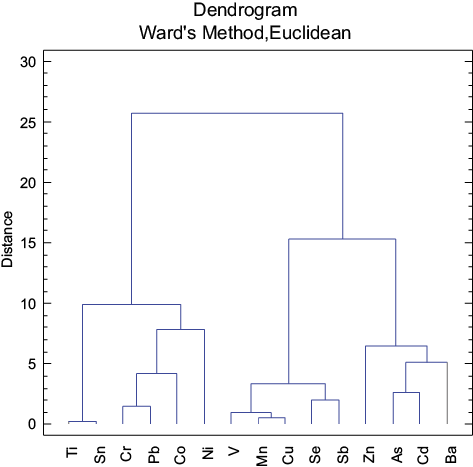 The number of samples was insufficient to run typical receptor models such as positive matrix factorization (PMF). Hence, in this study the statistical analysis of the results was based on cluster analysis (CA), considering the total element concentrations. Data standardization of each variable was performed prior to statistical analysis because the concentration orders among the elements and the parameters differed greatly, and statistical results would be highly biased by elements with high concentration. The furthest neighbor method was applied for grouping of the different variables, and dissimilarity was defined by the square Euclidean distance. With this method we were not able to obtain sources and/or atmospheric processes; however, the results should be indicative of possible element associations when source apportionment studies are conducted.