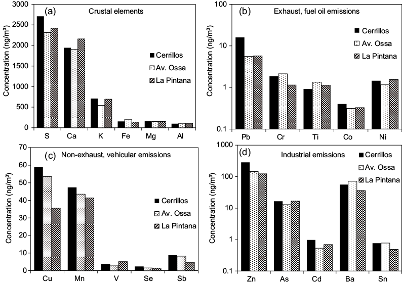 The results from the cluster analysis in Figure 6 give an approximate composition of the sources responsible for the measured PM. Figure 8 gives the concentration of soluble elements according to these sources separated according to the sites. It is found in Figure 8a that La Pintana has a higher concentration of crustal elements (Ca, K, Mg and Al), which is due to the fact that this site is located towards the south of Santiago (see Fig. 1), far from downtown, thus it receives more influence from rural environments. Exhaust and fuel oil emissions do not show a preferred trend and all stations have similar concentrations from this source. This figure indicates that exhaust emissions are well distributed over the city, which can be explained because mobile sources are spread out. Non-exhaust vehicular emissions seem to be higher in Cerrillos although Cu and Mn could also be generated in industrial processes. Industrial emissions are shown in Figure 8d, which also seem to be higher in Cerrillos. This can be explained because in this sector there are several large industries and many small auto repair and paint shops.