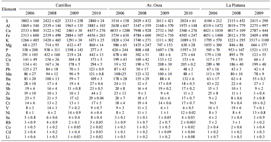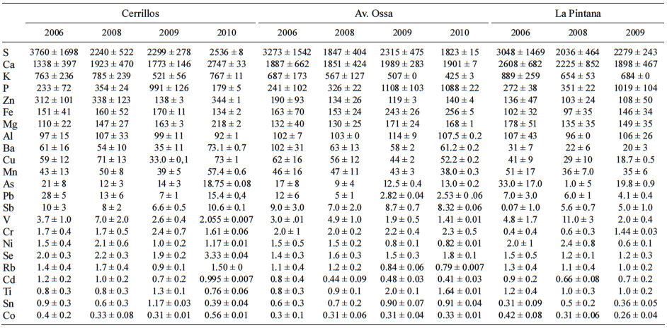 Table III shows monthly average concentrations for each site and year of major and trace elements. By combining the information presented in Tables I and III we were able to prepare Figure 5, in which the soluble/insoluble partitioning mass concentration of each of the elements determined in this study is shown. After sulfur, clearly shifted towards the soluble fraction (> 90% of the total mass was found as soluble compounds), specific trace elements such as Ba, Sb, Cd, As, and Zn displayed a significant water-soluble content, with 50% to 73%. Keeping in mind that some of these elements are considered toxic and/or carcinogenic (As, Cd and Zn) to human beings (Hughes, 2002; Lafuente, 2013), our results are even more relevant. It has been found that the urban atmosphere of Santiago is highly enriched in trace elements, some of them highly soluble and therefore with a higher toxicological potential with respect to other less soluble or practically insoluble. On the other hand, Al, Mg, Zr, Ti, Sn, Cr, and Pb showed a preference for the non-soluble fraction, with relative abundances of 75-99%.