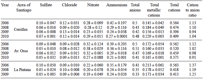 Regarding water-soluble PM10 components (sulfate, nitrate, ammonium and chloride), Table II shows that the most abundant is ammonium, with concentrations between 0.42 and 0.21 µEq m–3. Nitrate is the second compound in abundance, in the range of 0.38 to 0.19 µEq m–3; followed by chloride, showing concentrations in the range of 0.12 to 0.08 µEq m–3, and finally sulfate in the range of 0.10 to 0.05 µEq m–3. These results are not surprising: urban pollution episodes are generally characterized by huge quantities of secondary inorganic and organic components. Amongst the inorganic ones, ammonium nitrate is the foremost abundant component, mostly derived from the transformation in the atmosphere of combustion exhausts (NOx to nitrates) from industry and vehicles.