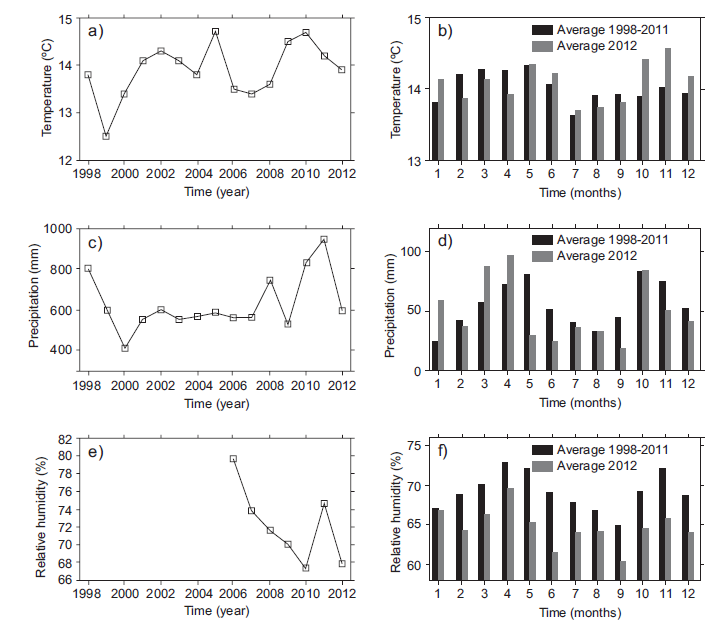 The registered annual and monthly average RHs between 2006 and 2012 are shown in Figures 2e, f, respectively. The average RH slightly decreases during the last years (Fig. 2e). The RH mean values recorded range between 65 and 80%. The higher value registered in 2011 is associated with the increase of precipitation during that year. March, April, May, October, November and December have the highest RH, which corresponds to the months of the year with highest precipitation.