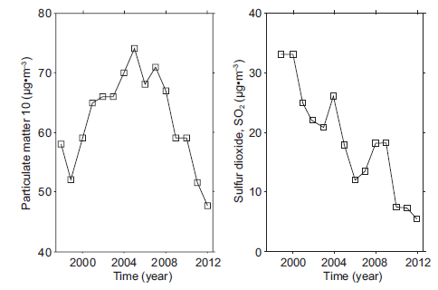 SO2 occurs mainly due to the use of fossil fuels with sulfur content such as coal, diesel or gasoline used in industries and automobiles. Industrial sources contribute about 60% of PM emissions and 70% of the SOx emissions into the atmosphere of Bogotá (Rojas, 2007). According to the local environmental authority, PM10 and SO2 concentrations decreased during the last years due to the control of permissible maximum levels in the industrial sector and mobile sources (such as public transportation systems). Figure 3a, b shows the effects of mandatory lower sulfur concentrations in fuel. These figures confirm the idea that the city is following the general trend of decreasing pollution in many capitals worldwide (Kucera, 2003).