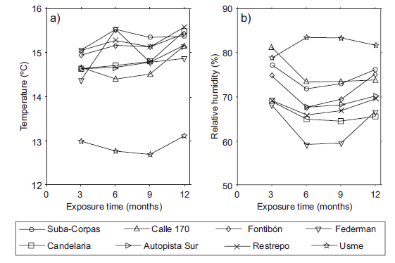 Commercial AISI-SAE 1006 carbon steel plates (100 × 150 × 1.6 mm) were used to evaluate corrosion rates. The composition of steel was 0.061% C, 0.015% Si, 0.180% Mn, 0.008% S, 0.001% P, 0.019% Cu, 0.040% Al, 0.020% Cr, 0.010% Ni. The plate surface was initially prepared by degreasing with ethanol and drying with an air jet. Before testing, the plates were weighed on an analytical balance of 0.1 mg of resolution; the initial mass was recorded and then they were stored in a desiccator prior to exposure. The evaluation of carbon steel plates was then carried out by triplicate over 12 months. Specimens were withdrawn after 3, 6, 9 and 12 months, between February 2012 and February 2013. Likewise, the values of RH and temperature were recorded continuously at each site using a thermohygrometer (42270 Extech) (recording three points per hour).