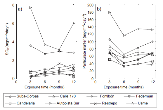 Deposition rates of SO2 and particulate matter (PM) were determined each three months using passive samplers, which allow quantification of cumulative air pollutant deposited on. The deposition rate of SO2 at each site was determined by the lead dioxide technique, according to standard ASTM D-2010 (ASTM_D2010, 2004). These candles were exposed for three months, then removed and replaced with other candles. The deposition rate of PM was determined in triplicate from petri glass dishes located into a louvered enclosure. After exposure, the disk was washed and the amount of deposited material was evaluated, which allows calculating the deposition rate of PM. Both candles and discs were installed in a rectangular louvered enclosure to provide maximum protection from rain.