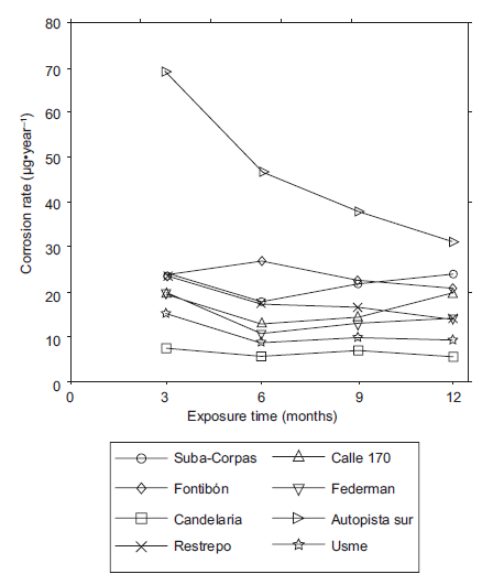 An average atmospheric corrosivity value on plain carbon steel could be ranged between 5 µm yr–1 and 35 µm yr–1 in Bogotá. The highest values are generally associated with higher SO2 levels, associated with regions of higher anthropogenic activity.