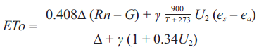 (1)where ETo represents the baseline evapotranspiration (mm day–1), Rn the net radiation in the crop surface (MJ m–2 day–1), G the soil heat flow (MJ m–2 day–1), T the air average temperature at a 2-m height (ºC), U2 the wind speed at a 2-m height (m s–1), es the saturation’s vapor pressure (kPa), ea the actual vapor pressure (kPa), es – ea the vapor pressure deficit (kPa), Δ the slope of the vapor pressure curve (kPa ºC–1), and γ the psychrometric constant (kPa ºC–1).