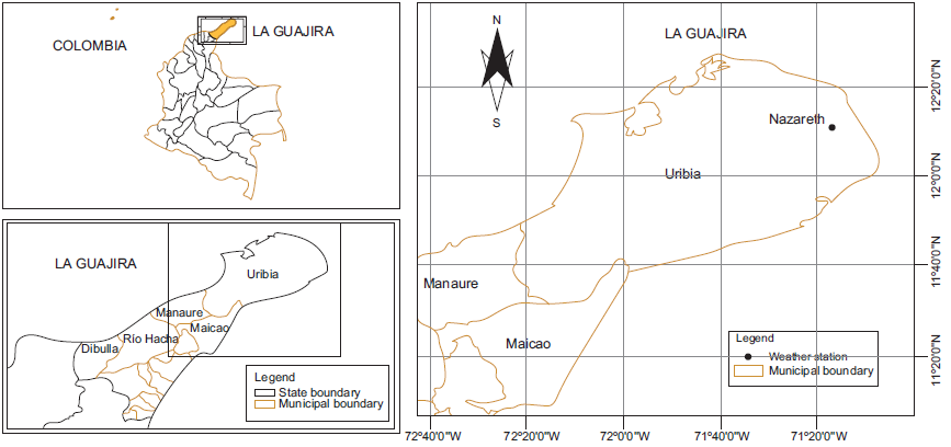 The station selected was Nazareth, located at 72º 15'57'' W, 11º 42' 50'' N in the state of Guajira (Fig. 1). Studies in this zone are critical, since the potential effects of climate change could certainly exacerbate the already deficient conditions, threatening the natural supply of water, its accessibility and all the activities that depend on this resource, increasing the gap between the natural supply and the constantly growing demand for the resource. This would increase the index of pressure over the resource and encourage or lead to conflicts.