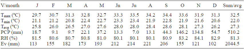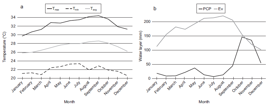 Analysis of the values collected at the station enabled us to determine why the study area has a Tmax, Tavg and Tmin of 32.5, 27.3 and 22.0 ºC, respectively (Fig. 2a). Even though PCP is scarce (about 510.2 mm), evaporation and evapotranspiration are higher than 2044.5 and 1521.1 mm, respectively (Fig. 2b) (the latter figure accounts for extreme desert conditions).