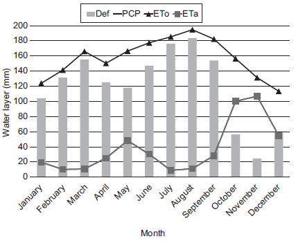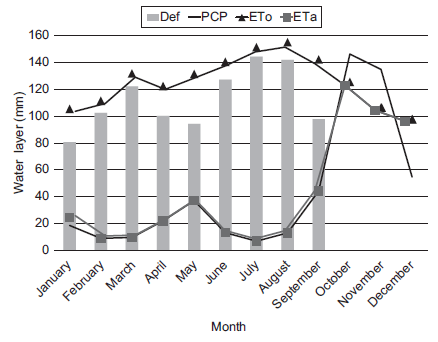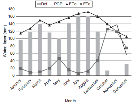 Figure 3 shows the behavior of PCP, ETo, ETa, Def and Excx of water in the study area, as a result of water balance analysis under the current climatic conditions.