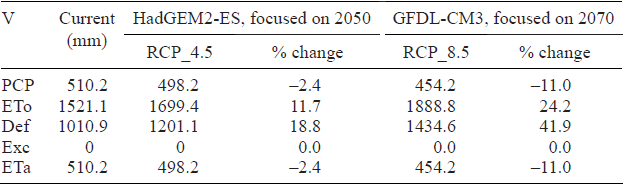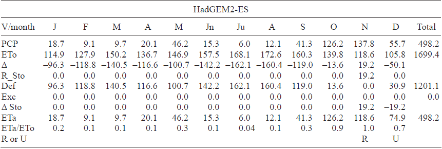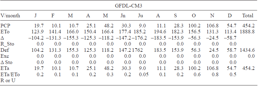 Tables VII and VIII present the water balance results for the periods analyzed, considering changes in the climatic variables projected for the HadGEM2-ES and GFDL-CM3 models.