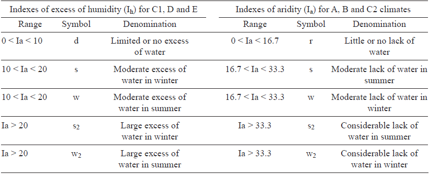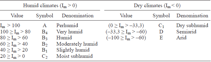 The moisture index can indicate how humid or arid a region is, but it cannot differentiate the seasonal variations; therefore, in humid climates (Im > 0) it could be necessary to determine whether there are dry seasons and assess the drought degree, while in dry climates (Im < 0) it could be necessary to determine whether there are humid seasons and assess the humidity degree. Annex A2 presents the subdivisions for humid climates (A, B, C2) and dry climates (C1, D, E).