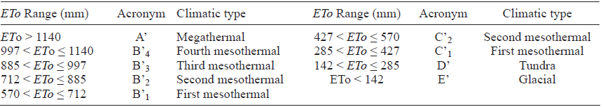 Table IV shows the values obtained for the indexes related to climate classification by the Thornthwaite method.