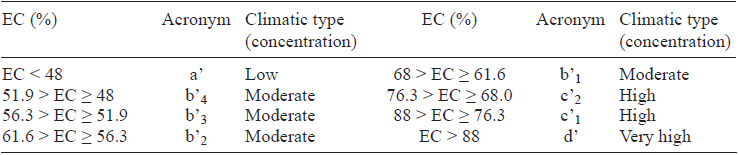 (6)where EC is the thermal efficiency concentration during summer, ETov the evapotranspiration of the three summer months, and ETo the annual evapotranspiration. Annex A4 shows the different thermal floors according to the thermal efficiency concentration in summer.
