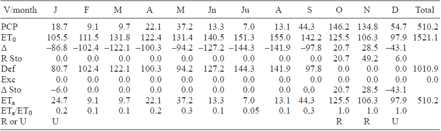 After obtaining the monthly value of PCP and ETo, other variables of the water balance were calculated. This consisted in defining the following parameters (in mm): the difference between precipitation and evapotranspiration (PCP – ETo [Δ]); the reserve or storage of usable water R(Sto); the deficit, excess, and variation in the reserve or storage of usable water (Def, Exc and ΔR [ΔSto], respectively); the actual evapotranspiration; the replacement (R); and the usage (U).