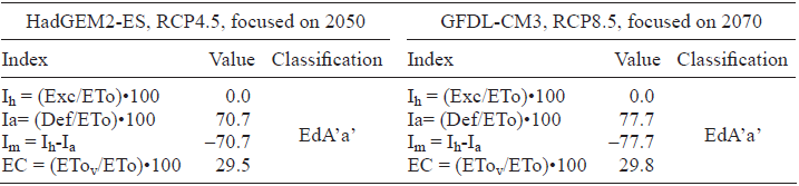 Table VI shows the values obtained for future indexes related to climate classification using the Thornthwaite method, taking into account the changes projected for the HadGEM2-ES model, period 2041-2060 (RCP 4.5), and GFDL-CM3, period 2061-2080 (RCP 8.5).