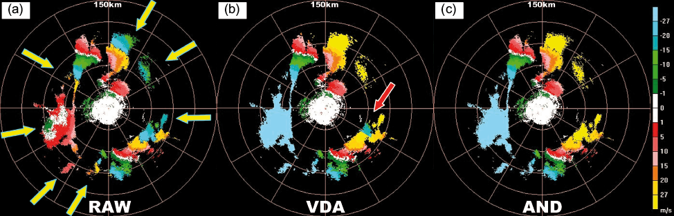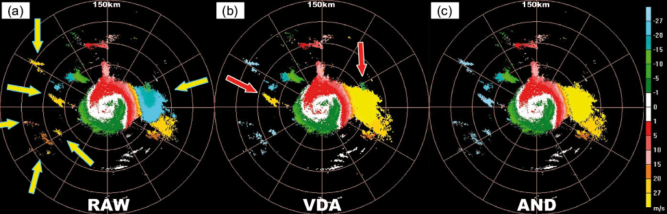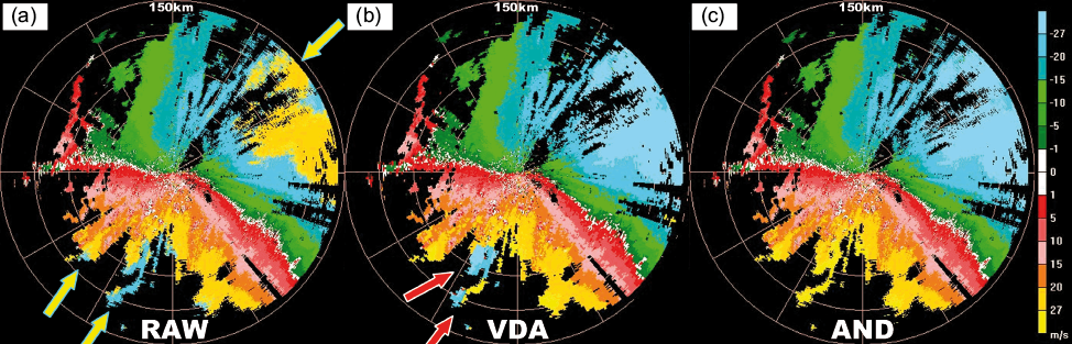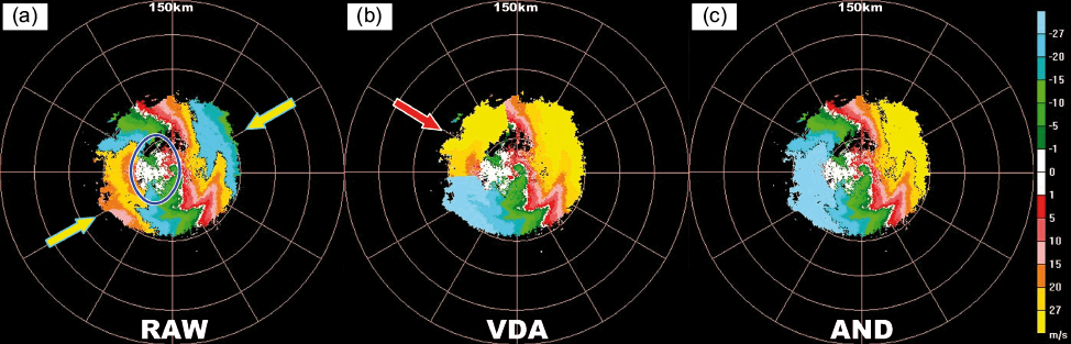 Owing to the large areas and higher reflectivity, dealiasing a typhoon is relatively easy, except for low elevation PPIs. Due to the interference of ground clutters, the typhoon velocity at low elevation angles is usually discontinuous, which easily leads to dealiasing errors. Figure 9 shows the radial velocity of the Chan-hom typhoon an elevation angle of 0.5º observed by the Hanzhou radar. Clearly, Figure 9a reveals three ambiguous velocity zones (yellow arrows). Within the range of 60 km form the radar, the typhoon echoes are mixed with ground clutters (white color). After dealiasing by VDA, the majority of ambiguous data were correctly recovered, but two errors subsist (red arrows in Fig. 9b). On the contrary, AND was not interfered by the low elevation ground clutters and well corrected all ambiguous data. Thus, this case confirms that AND can modestly resist the interference from ground clutters at low elevation angles.