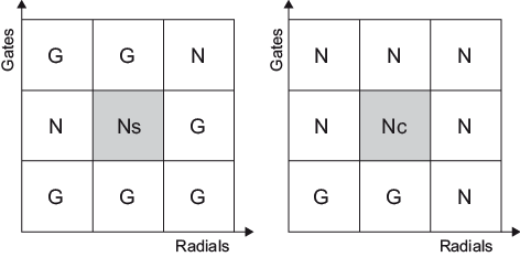 The general shortcoming of the above dealiasing algorithms is noise suppression. Dealiasing algorithms are all based on the hypothesis that velocity fields are spatially continuous. In case of discontinuity, these algorithms might produce errors. From the perspective of spatial distribution, noise can be divided into two types: isolated noise and continuous noise. If a noisy point is surrounded by more good points (non-noisy points including missing points) than noisy points, it is called an isolated noise; otherwise it is called a continuous noise. For example, in a 3 × 3 window in Figure 1, Ns is surrounded by six good points and two noisy points, so it is an isolated noise; Nc is surrounded by six noisy points and two good points, so it is a continuous noise. These two types of noise have distinct influences on dealiasing. Isolated noise can be eliminated by referring to the distribution of surrounding points, so it has little influence on dealiasing. But continuous noise can be hardly removed, so it has a severe influence on dealiasing. Continuous noise usually exists in the ground clutter region, the low signal noise ratio (SNR) region, and the high spectrum width region, and has severe influence on dealiasing results (Bergen and Albers, 1988; Witt et al., 2009). Continuous noise will increase the number of noisy points in a region to be larger than that of good points, so traditional algorithms such as filtering (e.g., Bergen and Albers, 1988) and smoothing (e.g., Boren et al., 1986) methods are ineffective for continuous noise and might make it more continuous. Also denoising algorithms for the ground clutter (e.g., Bergen and Albers, 1988), low SNR (e.g., He et al., 2012) and high spectrum width (e.g., Eilts and Smith, 1990; James and Houze, 2001; Gong et al., 2003) regions will mistakenly remove non-noisy points. Generally, if more noisy points are removed, more non-noisy points are lost. Therefore, these algorithms should be carefully used; also their repression ability on continuous noise is limited.