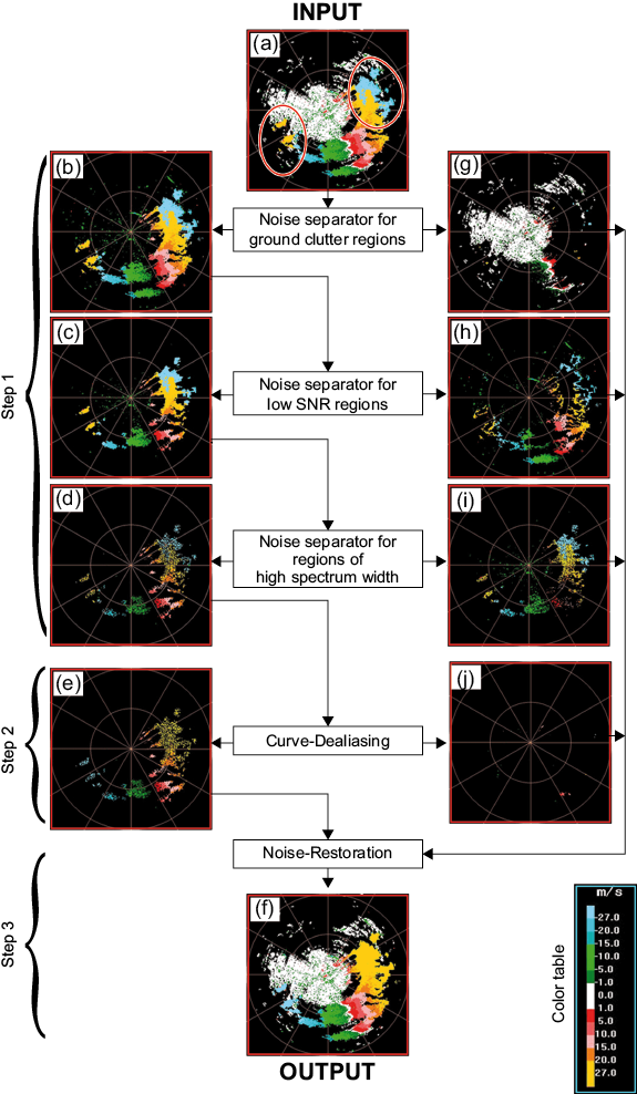 The flow of the AND algorithm is presented in Figure 2 and the details are described in sections 2.1-2.3. The raw velocities in Figure 2a were used as input for the AND. Two red ellipses contain a blue ambiguous area and a yellow ambiguous area inside. In step1, three noise separators with strict thresholds were used to separate noisy points. First, panel (a) in Figure 2 was separated by noise separators in the ground clutter region into panels b and g. Figure 2b shows the velocities after noise removal, andFigure 2g shows the noise in the ground clutter region. Then Figure 2b was separated by noise separators in the low SNR region into panels (c) and (h). Figure 2c shows the velocities after noise removal, and Figure 2h shows the noise in the low SNR region. Finally, Figure 2c was separated by the noise separator in the high spectrum width region into panels (d) and (i). Figure 2d shows the velocities after noise removal, and Figure 2i shows the noise in the high spectrum width region. In step 2, Figure 2d was dealiased into Figure 2e. Figure 2j shows the velocity without the reference velocity or failing in error check. In step 3, data in Figure 2g, h, i, and j were restored into Figure 2e, then each point was dealiased by Figure 2e. Figure 2f shows final velocities after dealiasing. Sections 2.1-2.3 present the details of all steps and thresholds of the AND algorithm.