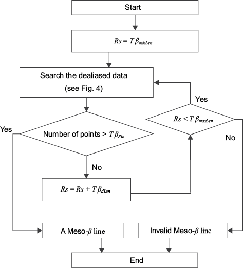 The procedure for fitting the meso-β line is illustrated in Fig. 3. The meso-β line has four thresholds: TβminLen, TβmaxLen, TβdLen, and TβPts.TβmaxLen and TβminLen are the maximum and minimum lengths of the meso-β line, respectively. TβdLen is the length increment of the meso-β line, and TβPts is the minimum number of points needed to fit the meso-β line. First, let the searching radius Rs = TβminLen and search the dealiased data in the current and the upper PPIs. As shown in Figure 4, there are five round searches centered at the current dealiasing point and in the radius of Rs. Round 1 searches along the current dealiasing radial in the current dealiasing PPI. Round 2 searches along the previous radial in the current PPI. Rounds 3-5 are similar to round 2, except for the upper PPI. If the number of valid points is smaller than TβPts, then extend the searching radius. Let Rs = Rs + TβdLen and search five rounds again. Repeat until the number of valid points exceeds TβPts or Rs > TβmaxLen. After searching, if the number of valid points is larger thanTβPts, the least squares method is applied to fit the meso-β line; otherwise the meso-β line is marked as invalid. The meso-γ line is fitted in the same way as the meso-β line, except for the thresholds. The meso-γ line has four thresholds: TγminLen, TγmaxLen, TγdLen and TγPts.