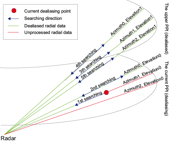 Yamada and Chong (1999) developed a VAD-based dealiasing algorithm. The initial position of dealiasing was selected to the distance circle with most points, and ambiguity was corrected by referring to VAD wind information. Since ambiguous data could cause error to VAD, a modified VAD (MVAD) was proposed by Tabary et al. (2001). The MVAD utilized the velocity gradient to retrieve vertical wind profiles, thus it reduced influence from ambiguous data. Later, a three-step dealiasing algorithm based on MVAD was proposed by Gong et al. (2003). First, global ambiguous data were corrected by MVAD; then local ambiguous data were restored by VAD; finally, residual ambiguous data were eliminated by using the continuity principle along radial direction. This algorithm was later optimized by Xu et al. (2011).