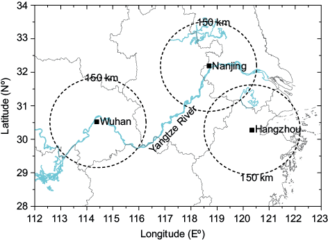 Since 1998, more than 200 operational Doppler weather radars have been installed in China, which constitute the China Next Generation Weather Radar (CINRAD) network. CINRAD-SA is one type of S-band radars located in East China and it is widely used to estimate precipitation, monitor severe weather events and improve numerical weather prediction (data assimilation). CINRAD-SA operates a volume scan at nine elevation angles from 0.5º to 19.5º. The maximum range of the radial velocity field is 150 km (Chu et al., 2014). In this study, three CINRAD-SA radars were selected to evaluate the proposed AND algorithm, including the Wuhan (30.52º N, 114.38º E), Nanjing (32.19º N, 118.70º E), and Hangzhou (30.27º N, 120.34º E) radars (Fig. 5).