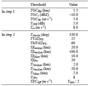 A ground clutter region is circumfused with noise, especially continuous noise. Three conditions are defined: (1) The height of echo is below the threshold TGCHgt (all the thresholds are listed in Table I); (2) reflectivity is above the threshold TGCZ; (3) absolute velocity is below the TGCVel threshold. All velocity points that satisfy these three conditions are separated and replaced by a missing value.