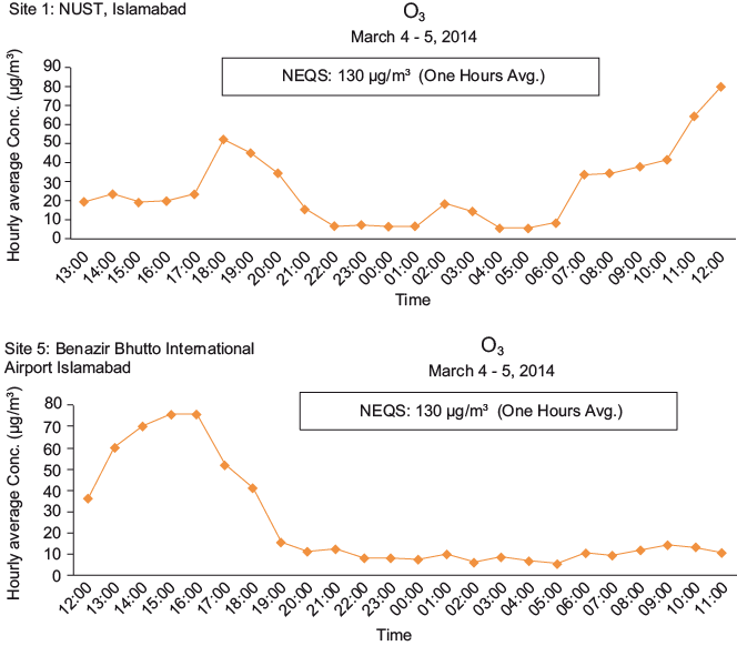 An O3 monitor (APOA-370, Horiba) with detection limit of 0.5 ppb and range of 0-1 ppm was used to determine O3 concentrations in ambient air. This monitor works on the principle of UV photometry. The overall concentration of O3 was found to be within the permissible limits of NEQs and USEPA. Among the monitored sites, NUST, Benazir international airport and Faizabad showed peak values as compared to others (26.1, 24.3 and 20.9 µg m–3, respectively as shown in Figure 8.