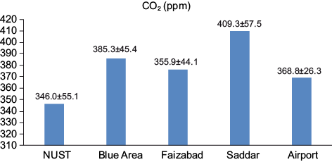 Concentrations of CO2 during the study period were found to be higher in almost all locations. Saddar, Rawalpindi showed the highest value (409 ppm), which is due to heavier traffic on congested roads. Vehicular emissions are probably the main source for the high levels of CO2, followed by the Westridge industrial area, which is also driving CO2 concentrations. Concentrations at the Blue Area and NUST in Islamabad were observed to be 385.3 and 246.0 ppm, respectively. At the Faizabad and Airport sites, CO2 values were 375.9 and 368.8 ppm, respectively.