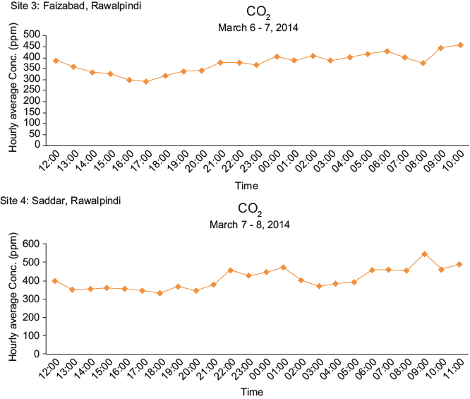 Concentrations of CO2 at the Faizabad and Airport sites have values of 375.9 and 368.8 ppm, respectively. Overall, CO2 concentrations seem to be high in all the sites. Hourly average concentrations showed that, throughout the day, CO2 concentrations remained high, as shown in Figure 11.