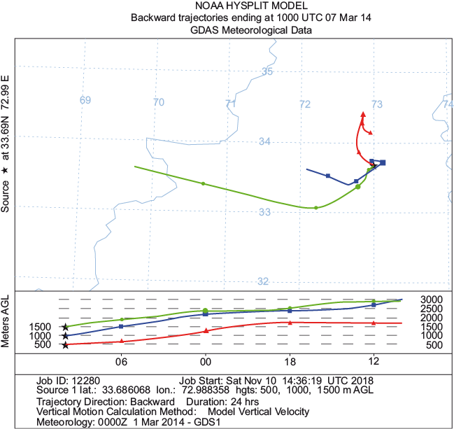 Different meteorological parameters were also observed during the study periods, which include humidity, temperature, average wind direction and wind speed. To find out the probable source of different measured pollutants, backward air trajectories were generated using the Hybrid-Single Particle Lagrangian Integrated Trajectory (HYSPLIT) model, generated by the US National Oceanic and Atmospheric Administration’s (NOAA) Air Resources Laboratory (ARL) website. Archives from the Global Data Assimilation System (GDAS) of the National Center for Environmental Prediction/National Center for Atmospheric Research (NCEP/NCAR) was used to generate the backward trajectories, which were calculated for a different heights, i.e., 500, 1000, and 1500 m above ground level for different time scales. The label interval was set to 6 h to track the path of trajectory.