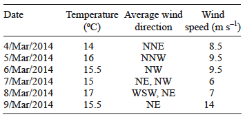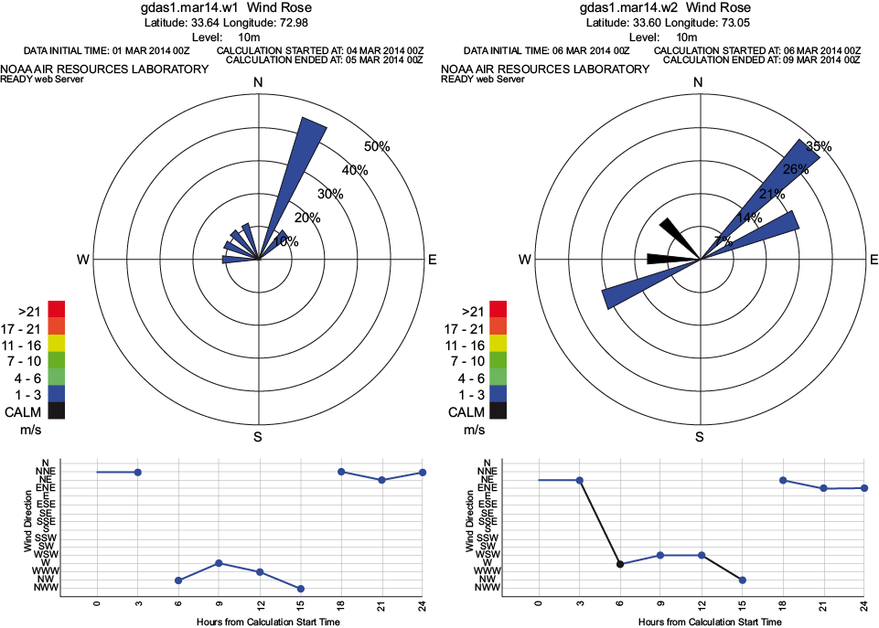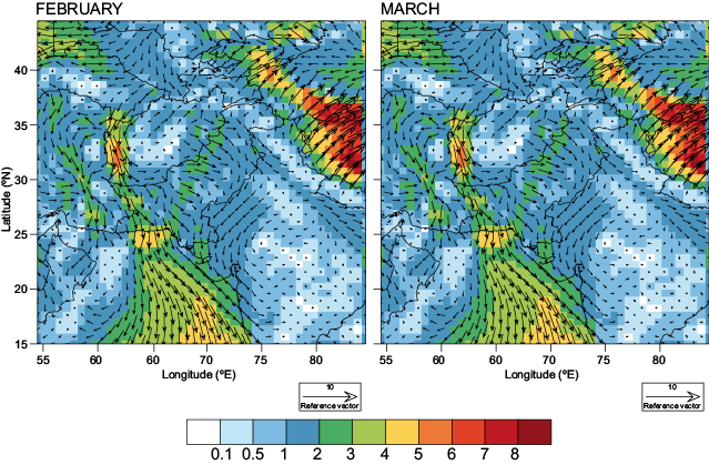 Monthly mean wind magnitudes and vectors (m s–1) from the MERRA 2 satellite data at a 10 m height during February and March 2014 were also plotted to regional wind patterns during the study period (Fig.14).