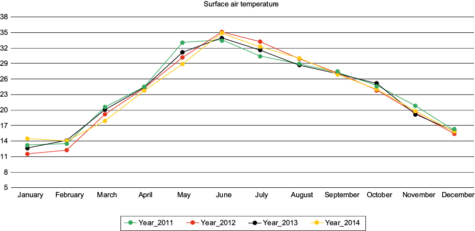Monthly trends of the observed surface area temperature in the study area from 2011 to 2014 are very similar in the different years of the period (Fig. 15). Surface area temperature is lower in winter and elevates from April until July. The maximum surface area temperature can be seen during June in each year.