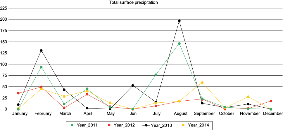 Precipitation data from 2011 to 2014 showed higher values during the monsoon season (July-August), while lower values are observed in the post-monsoon season (September-December). In January-March higher precipitation rates are observed in all the years, as shown in Figure 16. The pre-monsoon season (April to June) shows comparatively lower precipitation values. Overall, higher precipitation values are observed throughout 2013, followed by 2011. The years 2012 and 2014 have lower precipitation values compared to 2011 and 2013. Monthly precipitation trends show lower values in the pre-monsoon season and higher values during the month of monsoon. The annual comparison of precipitation data depicts the same trends in all years.