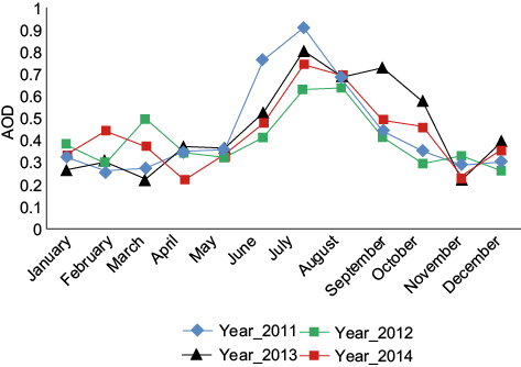 From the meteorological data we surmise that higher pollutants levels are observed during summer, mainly in June-August. Higher levels of MODIS AOD are also found in these months. The meteorological trends also suggest that levels of pollutants might be lower during winter. The AOD data validates this observation. Levels of MODIS AOD are low in winter. These trends are highly similar from 2011 to 2014.