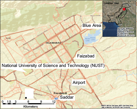 Islamabad (33.7294º N, 73.0931º E) is the federal capital of Pakistan, adjacent to Rawalpindi (33.5984º N, 73.0441º E). They are commonly referred as twin cities and are often considered as a single unit. The Rawalpindi-Islamabad metropolitan area is considered the third largest in Pakistan, with a population over 15 million. Both cities are located approximately 500-540 masl. Rawalpindi-Islamabad lay in a semi-arid zone with hot summers followed by monsoons and cold winters. The twin cities have with five seasons: winter (November-February), spring (March-April), summer (May-June), rainy monsoon (July-August) and autumn (September-October).
