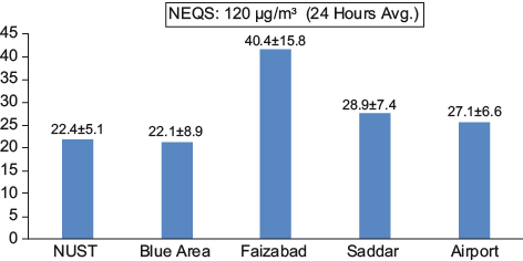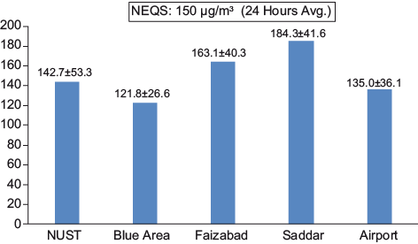 PM10 was monitored at selected locations within the twin cities as shown in Figure 1. The highest values for PM10 were observed in Saddar, Rawalpindi (184 µg m–3), while the minimum values were observed at the Blue Area of Islamabad (121 µg m–3). PM10 values observed at the National University of Science and Technology (NUST) and the Islamabad airport were found to be 142 and 135 µg m–3, respectively. These results are shown in Figure 2.