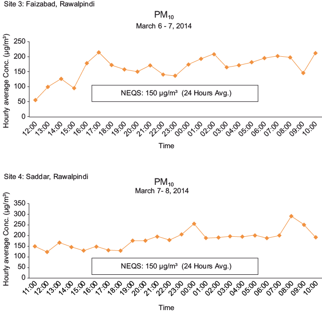 Overall PM10 concentrations at all locations showed elevated values between 8:00 LT and 10:00 LT, lapse in which many people travel from different regions to their offices and schools. High values of PM were also observed between 15:00-18:00 LT, when people return home from offices and schools. Another factor that contributed to high PM concentrations at this time was heavy traffic arriving to the twin cities, since the city administration and the capital’s traffic police allowed heavy traffic into the area around 17:00 LT. Possible sources of PM at this location include emissions from traffic, industries (I-9, I-10), windblown dust and biomass burning. The levels of the PM in the road dust were highly dependent on traffic volume and atmospheric spreading from traffic rotaries. Additional factors that affect PM concentration include vehicle speed, frequency of brake use and industrial emissions levels in the areas. Cemented highways usually had higher pollution levels than asphalt highways.