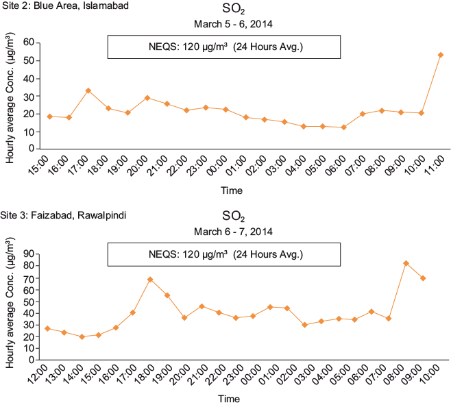 The levels of SO2 at most studied sites were within the permissible limits. Location 3 (Faizabad) showed higher values (40.4 µg m–3) as compared to other sites. SO2 concentrations at other locations, i.e. Saddar, Airport, Blue Area and NUST, were 28.9, 27.1, 22 and 22.4 µg m–3, respectively.