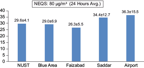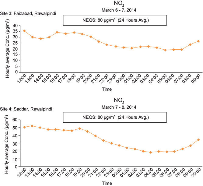 The NO2 concentrations were found to be within the permissible limits of NEQS and US-EPA. Concentrations within the twin cities were found to be within the range of 29.6 to 36.3 µg m–3 as shown in Figure 6.