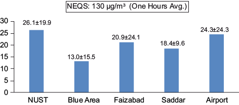 The overall concentration of O3 was found to be within the permissible limits of NEQS and USEPA. Among the monitored sites, NUST, Benazir International Airport and Faizabad showed peak values as compared to others (26.1, 24.3 and 20.9 µg m–3, respectively. Concentrations of O3 at other sites were comparative lower. The O3 concentration at Saddar was 18.3 µg m–3 while blue area Islamabad has lowest values among all other sites, i.e., 13.1 µg m–3.