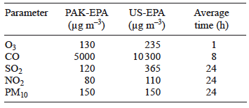 Bulbul et al. (2017) reported the morphology and concentrations of PM10 in Islamabad during the winter fog period. Shahid et al. (2015a, b) reported the sectorial contribution of aerosol in Pakistan and Usman-Alvi et al. (2017) reported traffic and industry related exposure to air quality in an industrialized city. Khokhar et al. (2016) studied the temporal variability of aerosol during winter while Zeb et al. (2018) reported the morphology of PM in urban environments of Pakistan. Awais et al. (2018) studied the optical properties of aerosols using remote sensing over the twin cities of Pakistan. Based on the previous studies and available information, in this study we assessed the status of air quality of Rawalpindi and Islamabad, where five major air pollutants were studied, i.e. PM10, SO2, NO2, O3 and CO2. The concentrations of these pollutants were measured in different locations within the above-mentioned cities and then compared with the standards of the National Environmental Quality Standards (NEQS) of Pakistan and the United States Environmental Protection Agency (US-EPA) (Table I).