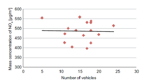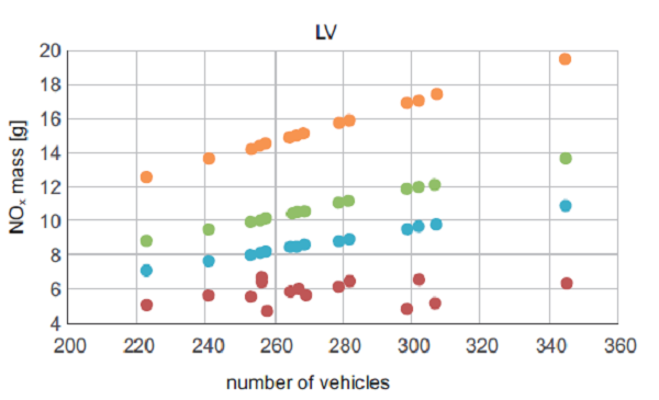 An important part of this study was the characterization of the impact of traffic intensity on NOx concentration levels in the short tunnel Zeleny most. During the measurements, simultaneous data of time-resolved NOx concentrations and passing vehicles calculations were acquired. For the statistical assessment of the correlation of the NOx mass concentration generated in the tunnel space and the traffic intensity, analysis of variance was used. Both correlations are graphically expressed in figures 8-10.