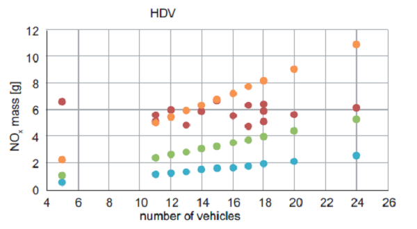 NO and NO2 masses, expressed summarily as NOx, corresponding to the HDVs intensity, monitored and calculated in the tunnel environment, are depicted in figure 12. Additionally, figure 12 depicts NOx masses calculated by the HBEFA 3.1 model for passing HDVs, corresponding to the fleet structure of this category registered in 2005, 2010, and 2015 in Germany. The results in figure 12 overestimate NOx emissions calculated by the applied model for the fleet structure of 2005, and underestimate the fleet structure of 2010 and 2015.