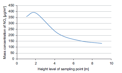 During each of the campaigns, NOx concentrations were measured at different heights in the tunnel to specify the sampling point position. The representative sampling point was chosen on the position where the highest concentration of NOx was detected. The NOx mass concentration dependence on different height positions of the sampling tube is shown in Fig. 4. The sampling point was chosen to be situated at 2 m above the tunnel ground level in the point where the highest NOx concentration was found, as depicted in Fig. 4, for the measurement campaign held on April 13, 2018.