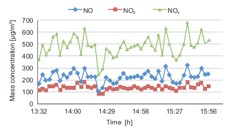 The pattern shows that concentrations of NO, NO2 and NOx varied during the whole measurement campaign. The actual hourly mass concentration limit of NOx at standard conditions (20 °C, 101.325 kPa) is 200 μg m–3 (Czech Republic, 2012). In this context it should be mentioned that during the measuring campaign no time interval was recorded in which the actual NOx mass concentration felt below the hourly NOx limit.