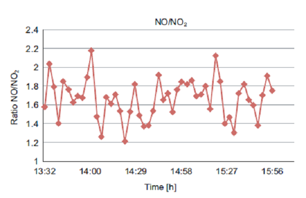 The time series of the ratio of NO and NO2 mass concentrations observed during all the measurement campaigns were found to be very similar. A typical example of this time series is depicted in figure 6.