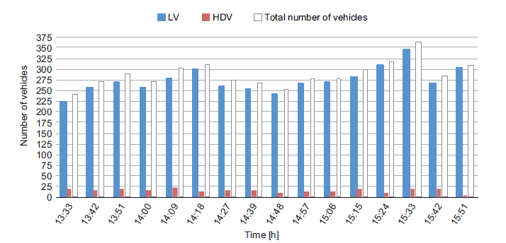 The measurement campaign held on April 13, 2018 lasted about 3 h in which high traffic intensity was noticed. The total number of vehicles that passed through the tunnel section of the D11 highway was 4615. It should be mentioned that during the course of the measuring campaign no time intervals were recorded in which the frequency of LVs felt below 240 crossings. The frequency of HDVs did not fall below five crossings but on the other hand it did not exceed 24 crossings in each 9 min interval.
