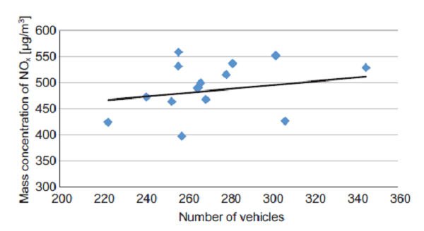 In the case of the LV category, the results of all measuring campaigns showed a linear dependency of the mass concentration of NO, NO2, and NOx on the number of passing vehicles. In the case of HVs, the linear dependence of the mass concentration of NO, NO2, and NOx on the number of passing vehicles was not ascertained in all campaigns. The results for HDVs were statistically influenced by the infrequent number of all individual vehicles compared to the number of LVs, which significantly influenced the value of random variations for this statistic interpretation.
