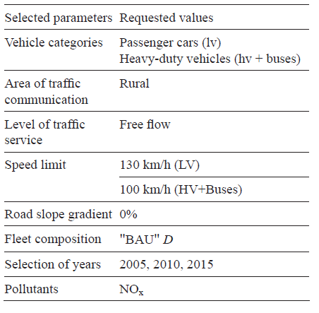 To specify the traffic scenario, selected parameters of HBEFA 3.1 were used together with the values listed in Table I. The fleet composition of the passing vehicle proceeds from the PHEM model based on summation of vehicles registered in the countries involved in the HBEFA model setup for the selected years (Hausberger et al., 2009). The fleet parameter "business-as-usual" (BAU) D corresponds to the composition of the vehicle fleet registered in Germany. The BAU D fleet composition parameter was chosen to verify the fleet model in the Czech Republic. This choice acknowledges the fact that the great majority of motor vehicles passing through Czech highways are equipped with the same engines as the vehicle engines in Germany. This assumption applies particularly for the most frequently used Czech vehicle brand, i.e. Škoda.